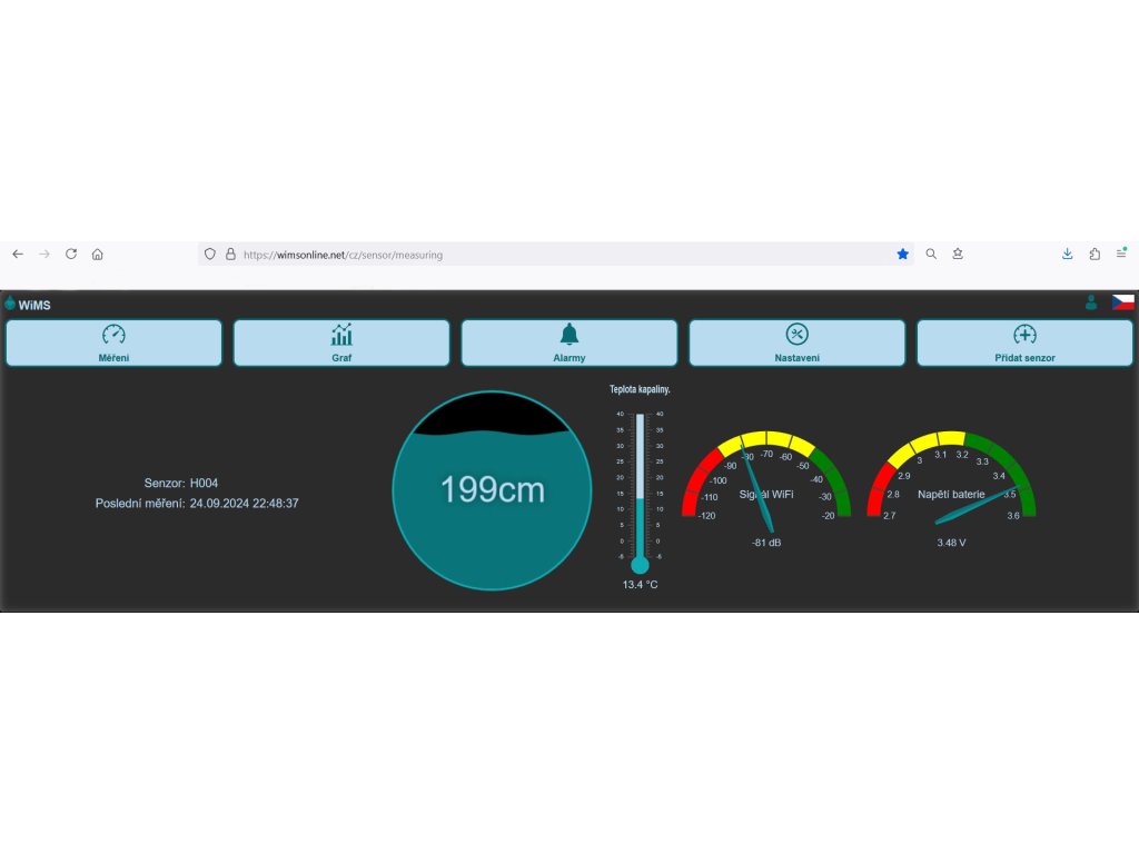 PopisWiMS-HS10 je elektronický měřicí systém s hydrostatickou sondou, dálkovým přístupem a ukládáním naměřených hodnot na server. Systém slouží k měření hladiny vody v nádržích, cisternách, studnách, hlubokých vrtech, zaplavených podzemních prostorách apod. Pro přenos dat je použita technologie WiFi, která je běžně dostupná v domácnostech nebo v kancelářských a průmyslových objektech. Napájení systému je zajištěno integrovanou baterií. Měřená data lze sledovat pomocí webového prohlížeče v mobilním telefonu, tabletu nebo počítači včetně grafického zobrazení hladiny za zvolené období. Přes WiFi rozhraní lze dálkově komunikovat s měřicím senzorem a nastavovat jeho parametry.