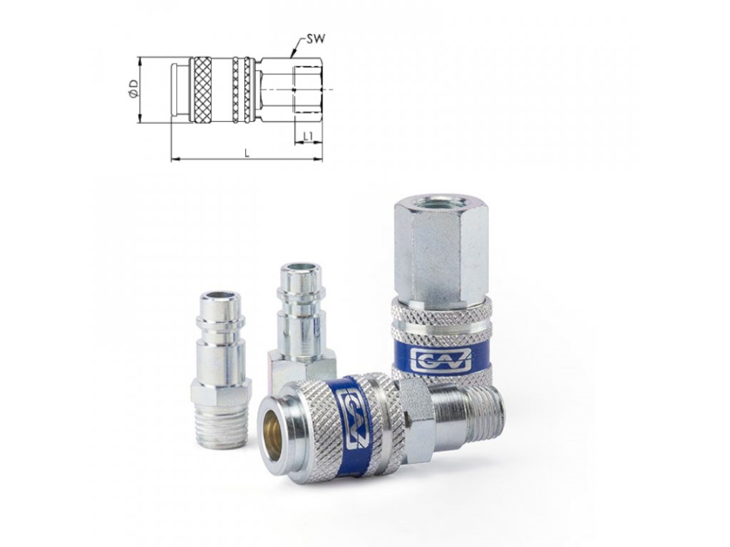 - Ocelové rychlospojky a vsuvky na stlačený vzduch, pozinkované, s vnějšími i vnitřními závity a s připojeními na hadice.- Profesionální univerzální rychlospojky a vsuvky z vysoce kvalitní, tvrzené oceli.