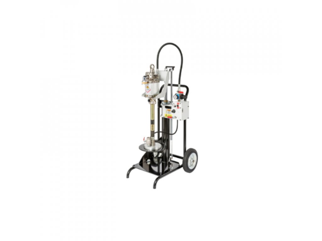 - Mobilní stojan pro pneumatická pístová čerpadla zajišťuje jednoduchou a rychlou výměnu sudu díky zvedacímu systému se dvěma sloupy, které jsou pneumaticky ovládané.- Výběrem modelu, který pracuje s přítlačnou membránou, můžete při obzvláště vysokých teplotách čerpat mazivo, které je ještě vyšší než stupeň NLGI 3, a také velmi viskózní kapaliny.