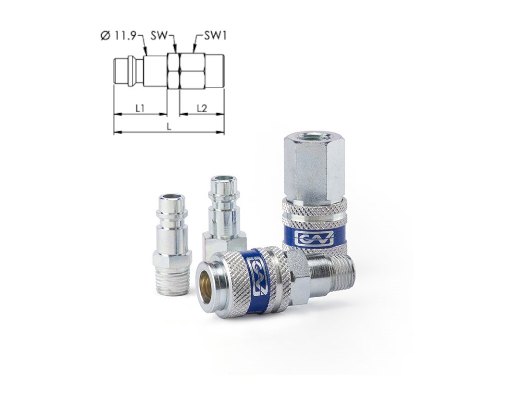 - Ocelové rychlospojky a vsuvky na stlačený vzduch, pozinkované, s vnějšími i vnitřními závity a s připojeními na hadice.- Profesionální univerzální rychlospojky a vsuvky z vysoce kvalitní, tvrzené oceli.