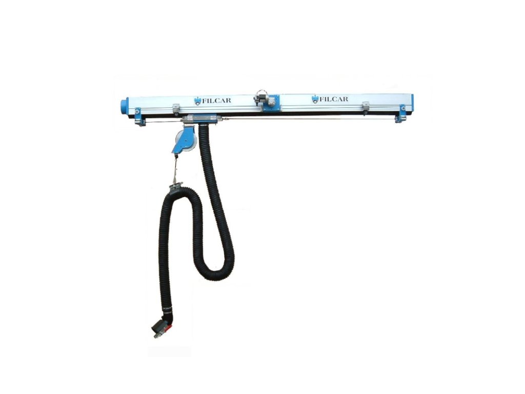 - Systém odsávání výfuku na hliníkové dráze XTK1 s posuvným vozíkem.- Odsávací hadice následuje vůz během kontroly nebo analýzy brzdné zkoušky.