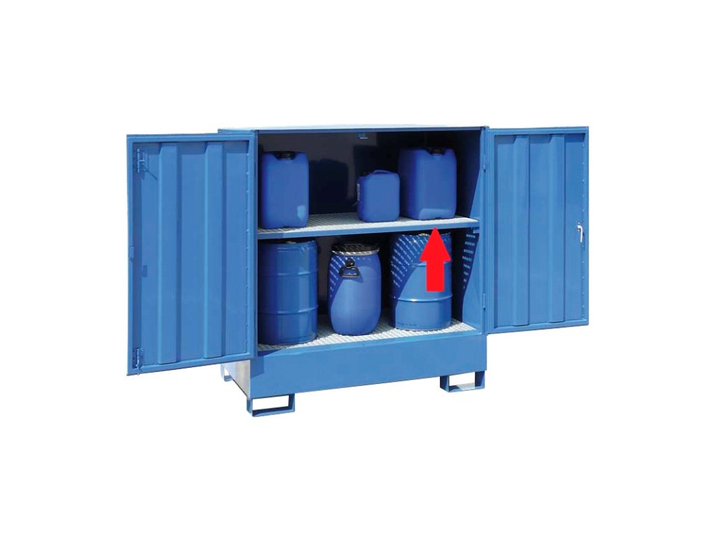 - Vhodné pro bezpečné a předpisové skladování vodu ohrožujících kapalin.- Dvoukřídlá vrata a odklápěcí víko usnadňují přístup ke skladovacím nádobám.