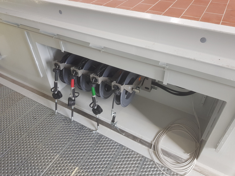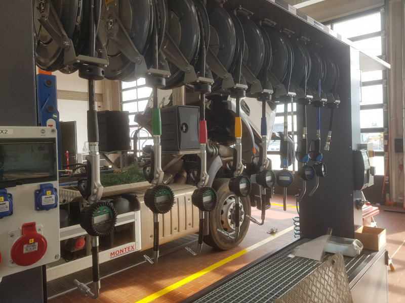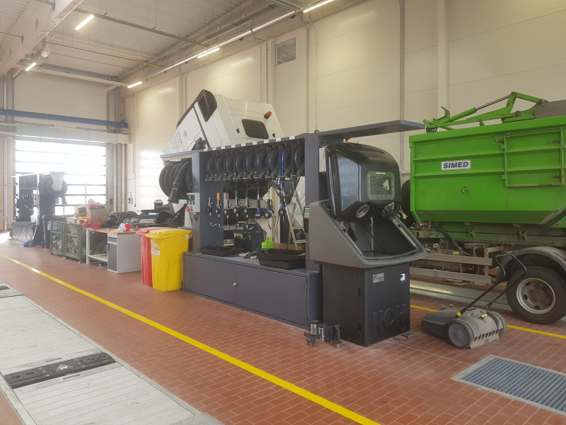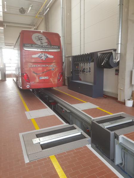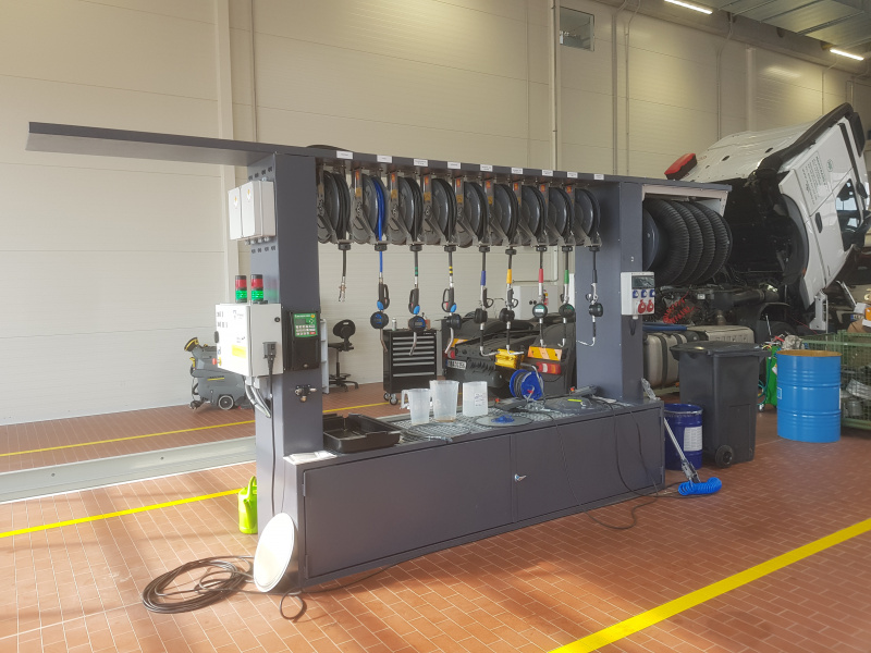 Kompletná dodávka na kľúč pre servis nákladných automobilov Mercedes-Benz Hošek Motor v Brne. Výdaj nových olejov a ďalších prevádzkových kvapalín z na zákazku vyrobených stojanov umiestnených v priestore. Každý stojan vybavený elektronickým terminálom pre prihlasovanie užívateľov a evidenciu zákaziek. Všetky dáta prenášané do PC. Odsávanie použitého oleja pomocou membránových pneumatických čerpadiel umiestnených na stojane. Sklad olejov umiestnený v poschodí. Plnenie nádrží pomocou stáčacej skrine umiestnenej na fasáde a vybavenej snímačmi pre maximálnu hladinu. Nádrž pre skladovanie použitého oleja je umiestnená pod zemou vonku servisu. Všetky rozvody umiestnené v podlahe. Dodávka vrátane odsávania výfukových splodín a rozvodu stlačeného vzduchu.