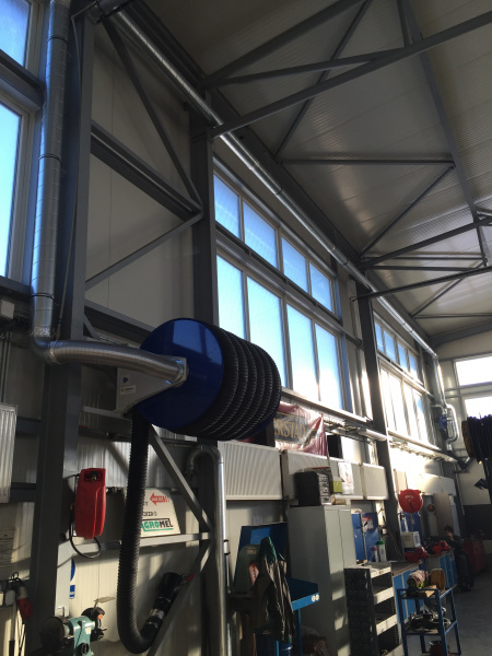 Realizácia odsávania výfukových splodín pre servis Agromel Klíčany. Jedno odsávacie miesto tvorené navíjacím bubnom, druhé odsávacie miesto osadené výklopným ramenom.