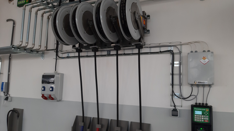 Realizácia olejového hospodárstva pre servis Scania ProScan Pardubice. Výdaj nových olejov pomocou navíjačov tlakových hadíc. Každé výdajné miesto osadené monitoringom výdaja s prenosom do PC. Odsávanie použitého oleja pomocou pneumatických odsávacích čerpadiel s centrálnou zbernou dvojplášťovou celokovovou nádržou. Dodávka vrátane kompletnej elektroinštalácie.