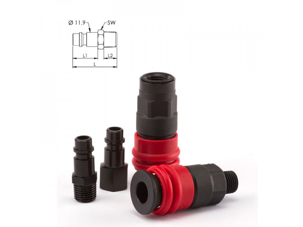 - Série rychlospojek z termoplastu s evropským standardním profilem vhodná pro lehké nářadí.- Speciální materiál, z něhož je vyroben, je vhodný i pro aplikace s tekoucí vodou.